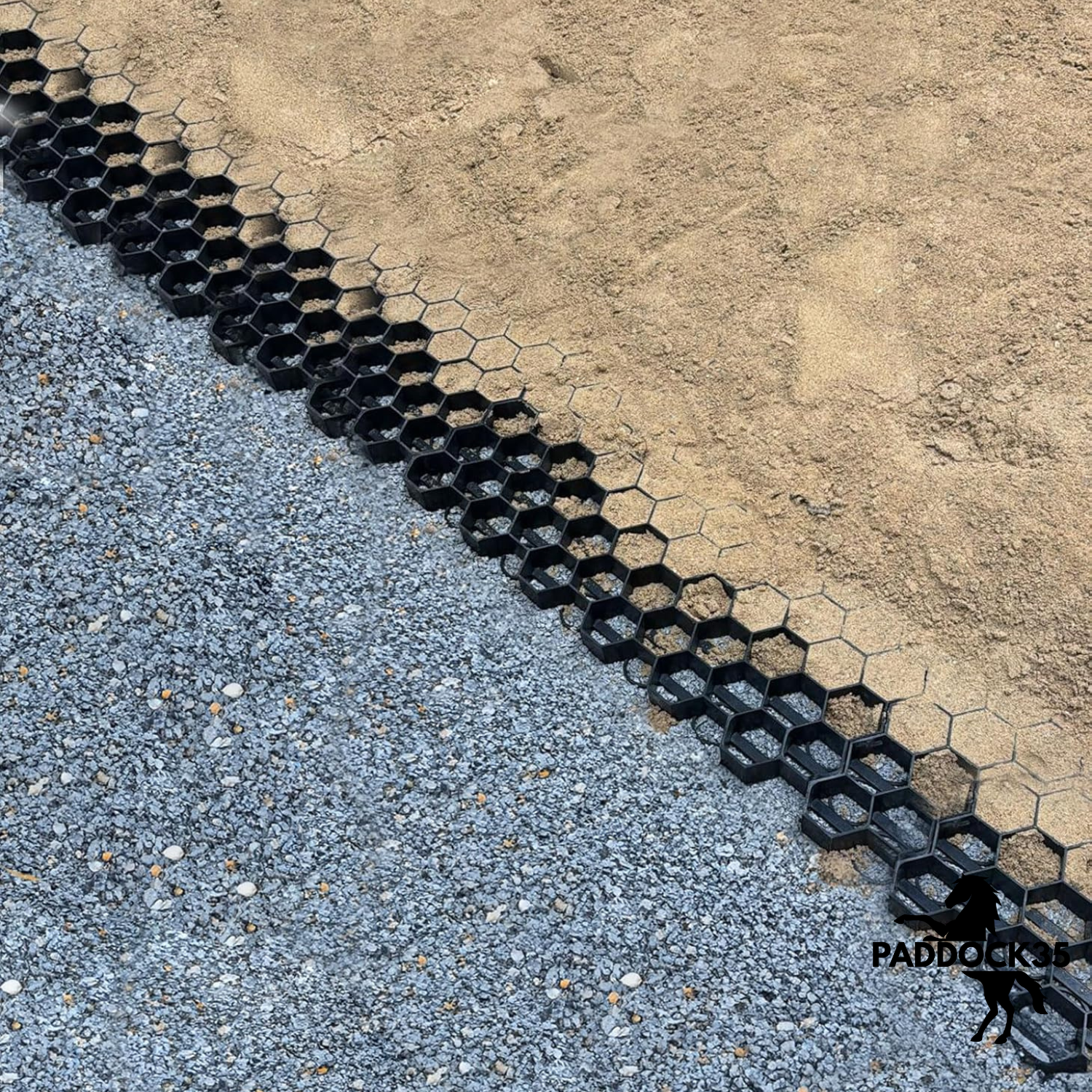 Die Platten sorgen für einen matschfreien Untergrund, sind hoch belastbar (bis 200 t/m²), wasserdurchlässig und frostbeständig. Damit eignen sie sich perfekt für Reitplätze, Offenställe, Ausläufe, Koppelzufahrten und sogar Parkflächen.